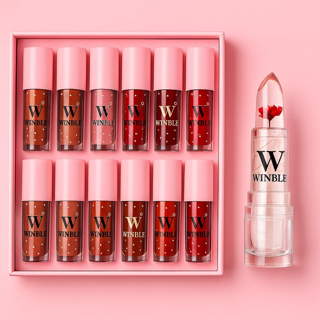 💄 Winble 12-in-1 Lipstick Combo Set is perfect for women & girls who love to keep their lips soft, stylish & beautiful! This set includes: 🌸 1 Color Changing Jelly Flower Lip Balm – Hydrating & transparent with real flower inside 💧 1 Glossy Lip Oil – Moisturizing & shiny for daily use 💋 12 Matte & Glossy Liquid Lipsticks – Waterproof, long-lasting & non-transfer 🎁 Comes in a compact, book-style gift box – Great for travel or gifting! ✨ Ideal for parties, weddings, college, office & everyday makeup looks.