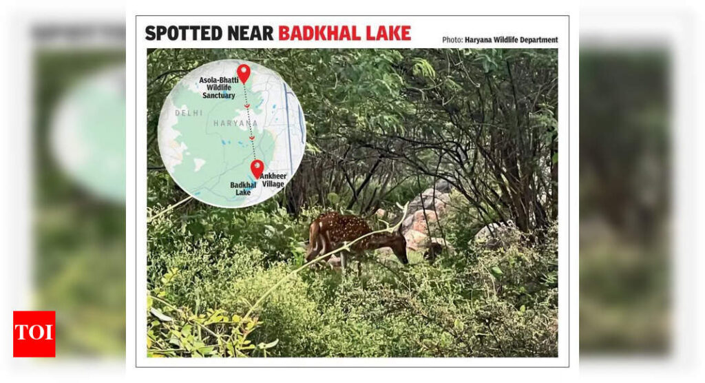 Gurgaon: A spotted deer — or chital — with its distinctive russet-brown coat and white spots, was observed near Badkhal lake in the Faridabad Aravalis by forest department officials on Thursday. This sighting is believed to be the first recorded appearance of this species in the district, sparking hope and excitement within the wildlife community.Historically, the chital roamed freely across the Aravalis, stretching from Gurgaon to the Delhi Ridge. However, the rapid urbanisation of the 1980s and 1990s — fuelled by mining, real estate expansion, and deforestation — fragmented their habitats, pushing them into core forest zones like the Asola-Bhatti wildlife sanctuary. A 2017 Wildlife Institute of India (WII) survey of Haryana’s Aravalis reported a significant decline in wildlife population, including that of the spotted deer, due to habitat loss and fragmentation.According to officials, this is the first confirmed sighting of a spotted deer in the Aravalis in recent records. Vivek Saxena, principal chief conservator of forests (wildlife), said, “We do not have data on the last sighting of chital in the Aravalis, but this sighting definitely shows that habitat improvements helped wildlife return to the region.”The sighting underscores the significance of green spaces at the urban fringe. Badkhal lake is situated at the edge of the Southern Aravali Ridge, which connects to the larger Delhi Ridge ecology and links with areas like the Asola-Bhatti sanctuary, an essential corridor for wildlife in this region.“Wildlife, when given undisturbed green spaces, sometimes ventures back into areas we might consider too crowded. This visit could indicate that the wildlife corridor is active or that native habitat is gradually reclaiming ground. Either way, it serves as a subtle reminder of the broader environmental threads still weaving through our daily lives,” said wildlife biologist Sumit Dookia.If sightings like this become more frequent, experts suggested it could be time to consider restoring or strengthening habitat links, including corridors between Asola and Sarika, where the spotted deer population is currently active.“Seeing a spotted deer in Faridabad is a positive sign. It shows that even small patches of forest and wetlands can support wildlife if they are protected. What’s crucial now is to ensure these green spaces remain connected so animals can move safely across the Aravalis,” said wildlife expert Sunil Harsana.