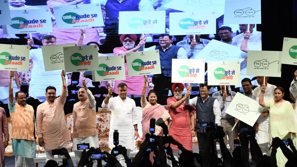 Delhi Chief Minister Rekha Gupta with Cabinet Ministers Parvesh Sahib Singh and Ashish Sood and Delhi Mayor Raja Iqbal Singh and others during the launch of ‘Freedom from Garbage’ campaign.