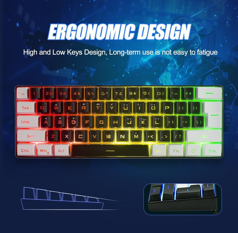 60% Compact Mini Design: 61-key keyboard is its compact size. It is significantly smaller than a full-sized keyboard, which makes it portable and saves space on your desk. This makes it suitable for gamers who need to transport their keyboard frequently or prefer a clutter-free gaming setup.