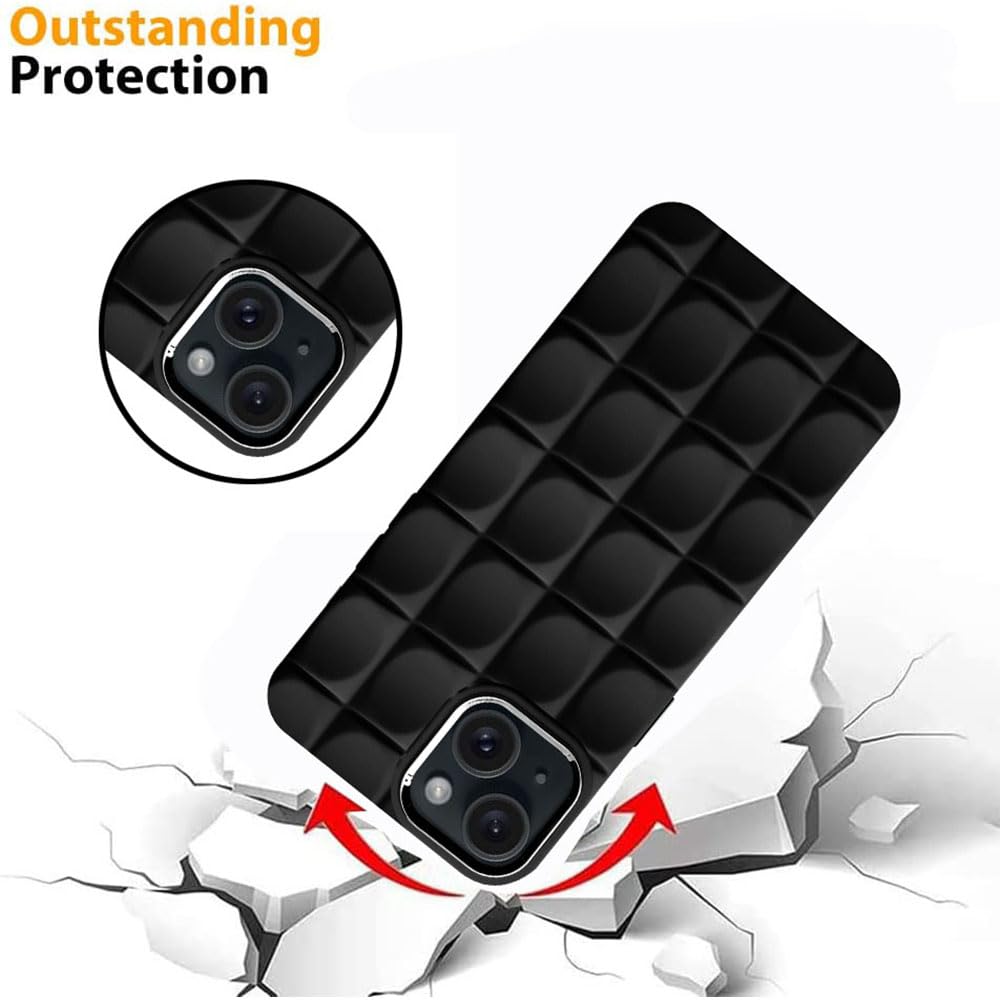 Amazon Brand-Solimo Back Cover for Apple iPhone 15 Plus | Cute 3D Laid Plaid Design | Electroplated Chrome Ring | Camera Protection | Raised Edges | Soft Silicone TPU Case for Women Girls (Black)