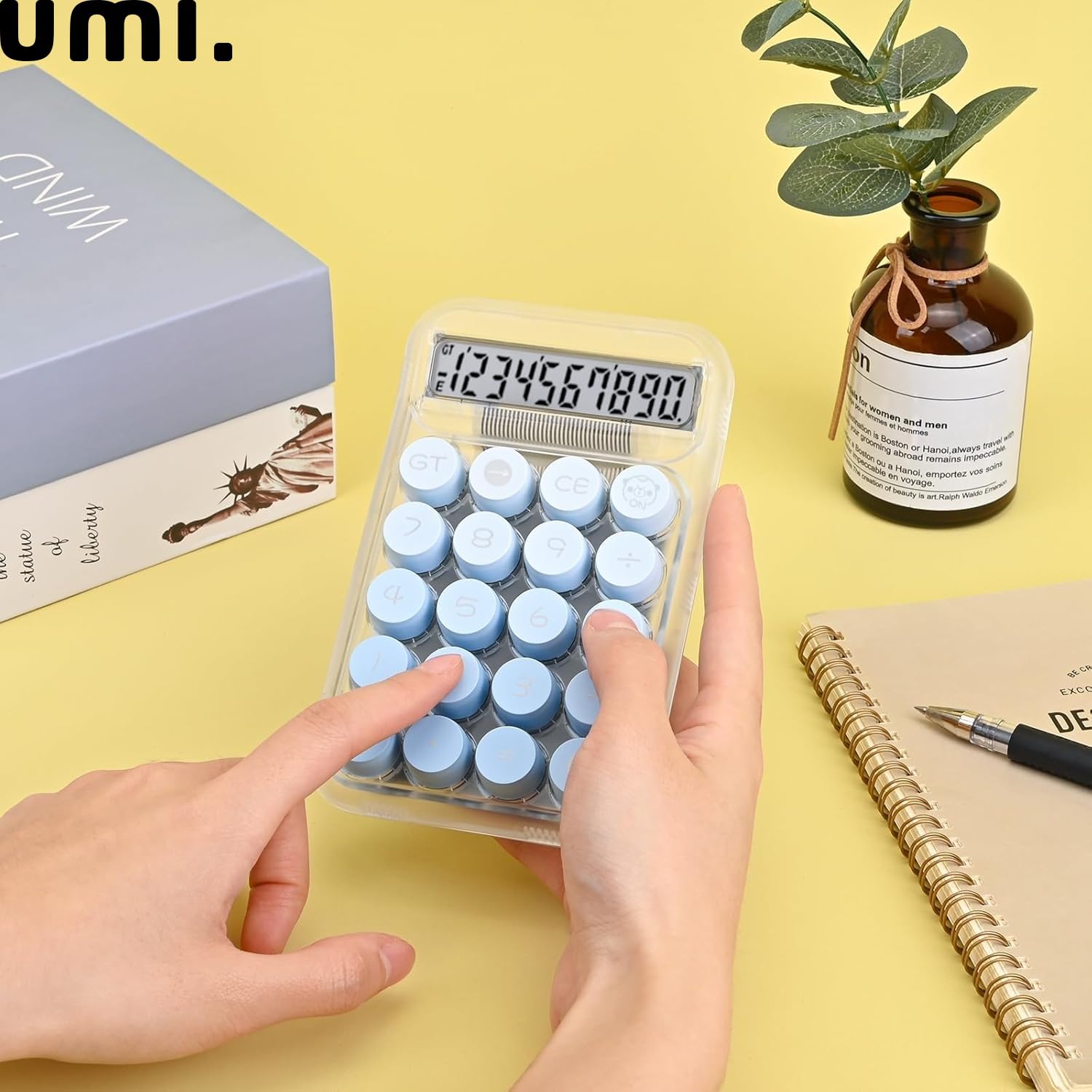 Cute design makes you feel good transparent calculator with cute pastel round buttons.Just look at this cute calculator to increase the motivation of studying and working. Easy to read LCD screen .Large 12-digit LCD screen and 15-degree slope body make it easy to read.4 non-slip rubber on the back of the calculator for excellent stability.No need to worry about it slipping out in the middle of numbering.One AAA battery can be used anywhere.(Batteries not included) . Crafted with advanced ABS material, our colorful calculators are built to last. The durable and reliable construction makes it a long-lasting companion for your daily calculations. The dynamic and personalized theme adds a touch of fashion to any workspace. With our calculators, you can rely on both style and functionality. Available in a variety of colors Available in 7 different designs to match your needs and space.Retro fashion light color calculator makes a great gift or gift. Elevate your desktop experience with this Desktop Calculator featuring big pastel candy colored buttons .Designed with an anti-slip bottom pad and a well-structured keyboard layout, this mechanical calculator stays in place and promotes hand comfort, aligning with ergonomic standards.Practical and good-looking, this mechanical calculator integrates perfectly into various business environments. With its high-looking design and transparent body combined with gradient color appearance, it adds a splash of color to your work surfaces while being a reliable tool.