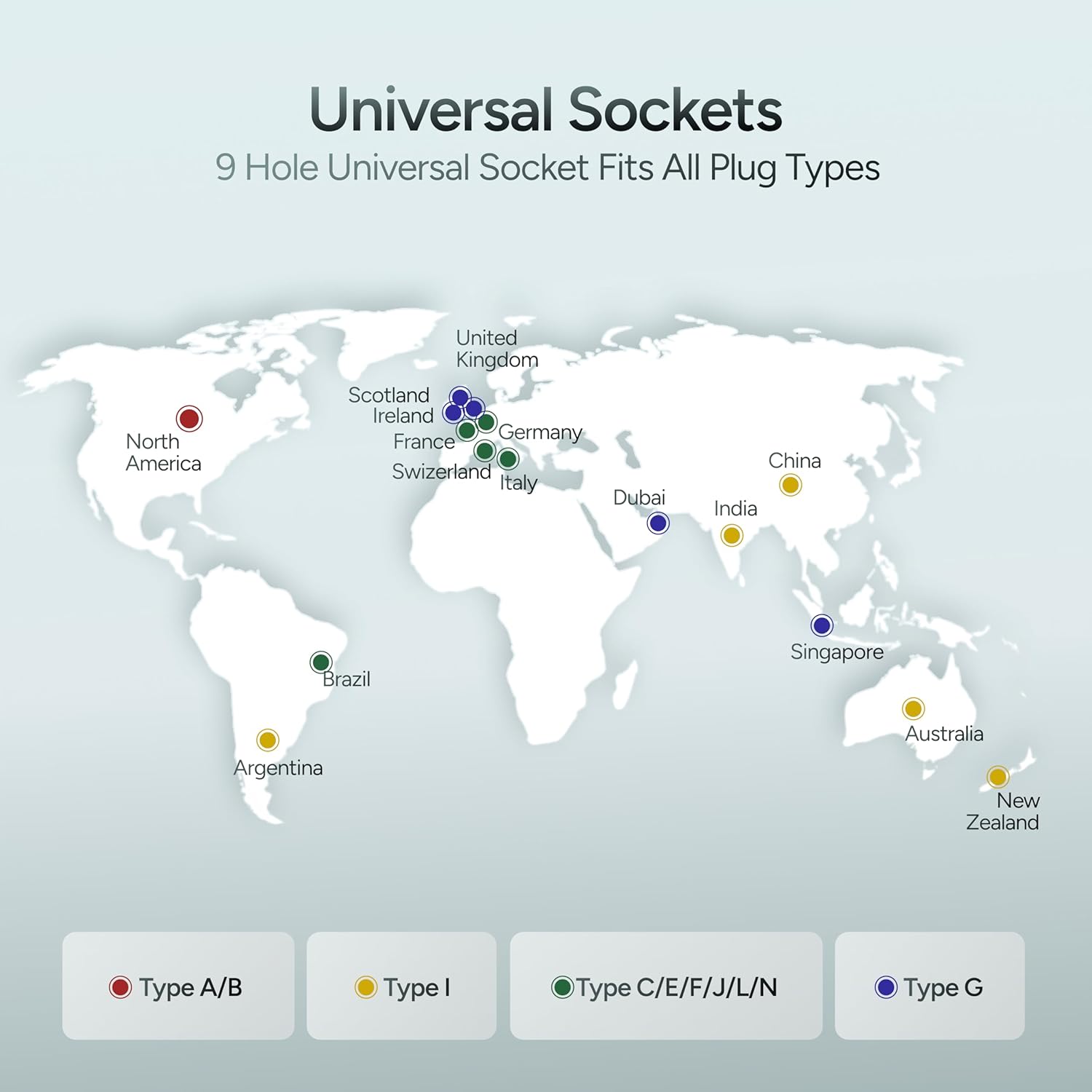 Use it in 150+ Countries: The 9-hole universal socket is designed to accommodate a wide variety of plug types. Compatible with US, UK, AUS, and EU standards, the adapter works seamlessly in 150+ countries.