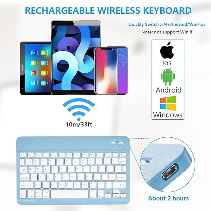 【Wireless Connect & Rechargebale】 Wireless connection with your mobile devices such as tablets and mobile phones, bring more convenience when you need to type, operating distance up to 10m/33ft. Through the included USB-C cable, 30-days continuous use or 120 days standby mode after fully charged.