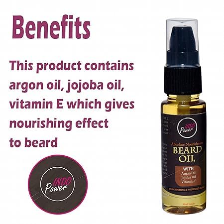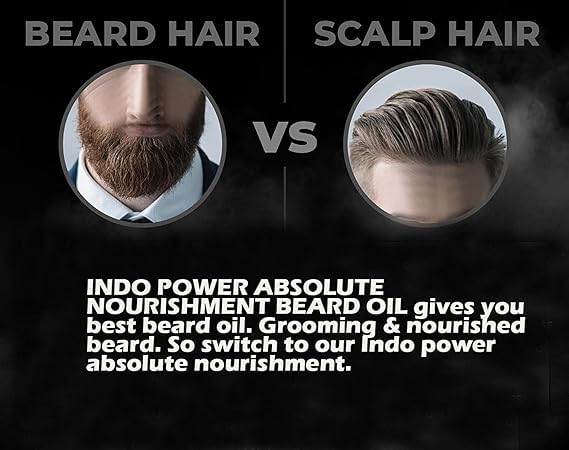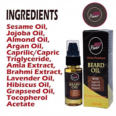 Product Description:- INDOPOWER ABSOLUTE NOURISHMENT BEARD OIL gives you best beard oil. Grooming & nourished beard. So switch to our INDOPOWER absolute nourishment. How to use:- USAGE DIRECTION: – Wash your face with water, take 3-4 drops of required quantity of INDOPOWER Absolute Nourishment Beard Oil in palm of your hand, Massage it on your beard & skin with finger tips for 2-3 minutes. Finally style the beard as you required. Use daily for best result. INGREDIENTS :- Sesame Oil, Jojoba Oil, Almond Oil, Argan Oil, Caprilic/Capric Triglyceride, Amla Extract, Brahmi Extract, Lavender Oil, Hibiscus Oil, Grapseed Oil, Tocopherol Acetate. Benefits:- This product contains argon oil, jojoba oil, vitamin E which gives nourishing effect to beard hair.