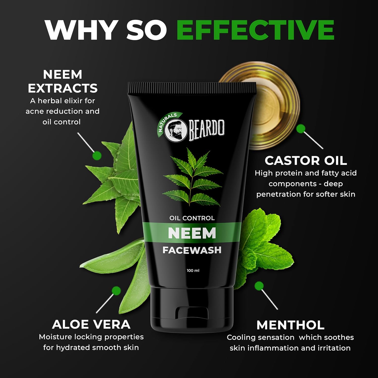 AS EFFECTIVE AS IT GETS: Neem and Aloe Vera extracts help remove dirt and excess oil without leaving the skin dry while Castor oil and Menthol soothe the skin and provide the required moisturization without being greasy.