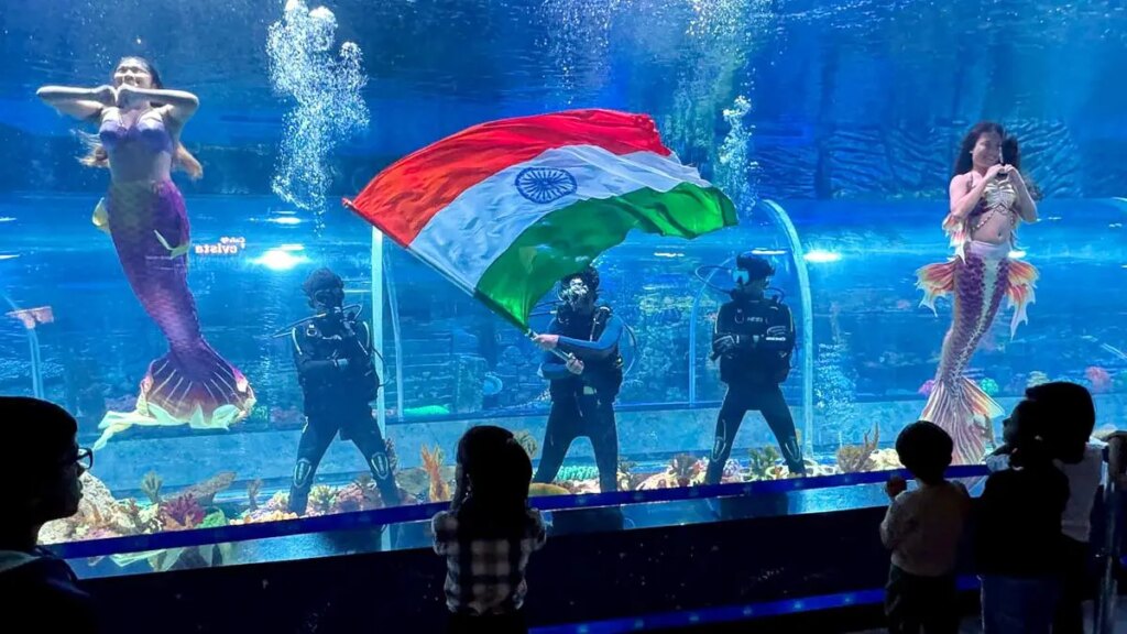 Scuba divers display the national flag at the Aquarium Paradise on the eve of the 79th Independence Day, in Chennai on Thursday