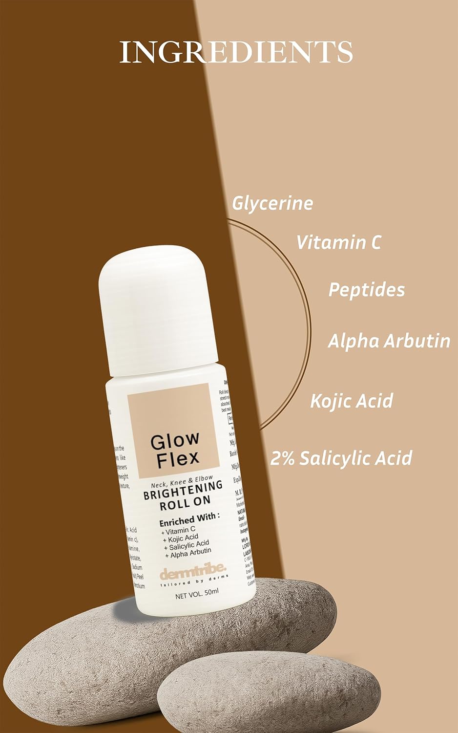 FADES DARK PATCHES & PIGMENTATION – Formulated with Kojic Acid and Alpha Arbutin, this roll-on targets discolored areas on the neck, elbows, and knees to visibly reduce uneven tone and improve brightness over time.