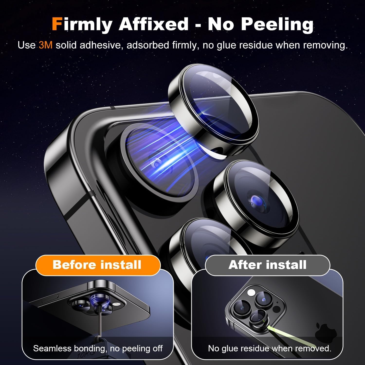 Easy to install: This for iPhone 15 pro max/15 pro camera lens protector is super easy to install, no tools are needed, just align the protector with the phone lens and press it securely. No fingerprints and no bubbles. And no residual glue when removed.