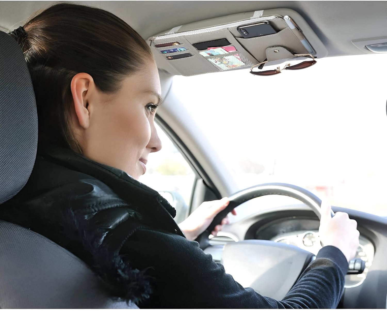 Increased SafetyHaving quick access to essentials like your driver’s license, insurance card, or sunglasses can reduce distractions while driving. This organizer allows you to store and access your essentials without the need to search through glove compartments or center consoles, keeping your focus on the road.Enhanced OrganizationWith its multiple compartments, the Car Sun Visor Organizer helps you declutter your car, ensuring everything has its designated place. No more loose papers or scattered items around your car. The organizer ensures that everything you need is right where it should be, making your car feel cleaner and more organized.Convenient for TravelThe Car Sun Visor Organizer is an ideal accessory for frequent travelers. It keeps your essential travel documents, such as your passport, boarding passes, and tickets, within easy reach while keeping them secure. Whether you’re heading to the airport or taking a road trip, this organizer ensures that your documents are neatly stored and easily accessible.Space-SavingTraditional car organizers often take up valuable seat or floor space, but the Car Sun Visor Organizer makes use of an underutilized area—your sun visor. By utilizing this space, you save room in your car and keep your essentials within reach without cluttering your car’s interior.Stylish and PracticalNot only does this organizer keep your items neat and organized, but it also adds a touch of style to your car’s interior. The sleek PU leather design blends seamlessly with most car interiors, providing both practicality and style in one simple accessory.Affordable SolutionThe Car Sun Visor Organizer offers an affordable solution to car organization. For a reasonable price, you get a multi-pocket storage unit that can make a big difference in how organized your car feels. It’s a small investment that can help you avoid the frustration of a cluttered and disorganized car.