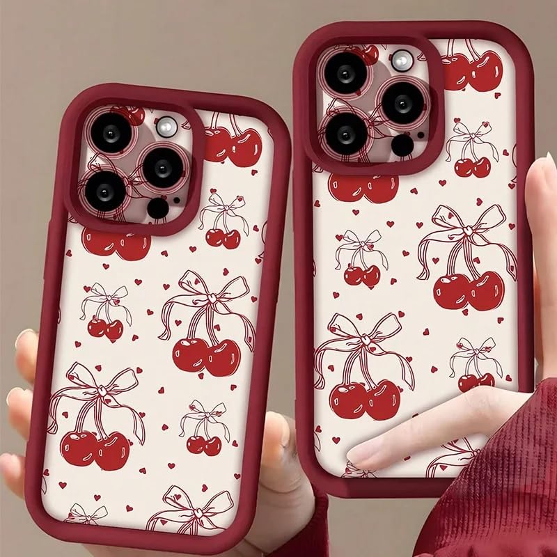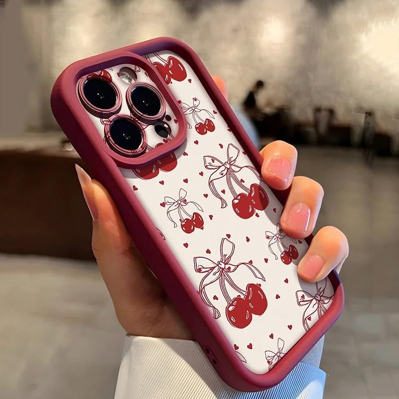 Add a sweet and stylish touch to your iPhone with this charming cherry-themed protective case. Featuring an adorable pattern of red cherries adorned with delicate bows and tiny hearts on a crisp white background, all encompassed by a burgundy bumper frame. The case offers comprehensive protection with its shock-absorbing TPU material and raised edges around the camera lenses. Compatible with various iPhone models including 11/12/13/14/15/16 series (Plus, Pro, Pro Max versions), this case combines aesthetic appeal with practical functionality. The soft silicone construction ensures easy installation while providing reliable protection against everyday bumps and scratches. The perfectly aligned cutouts maintain full access to all ports and buttons, while the precise camera housing safeguards your phone’s lenses. This kawaii-inspired design brings together playful elegance and robust protection, making it an ideal choice for those seeking both style and security for their iPhone.