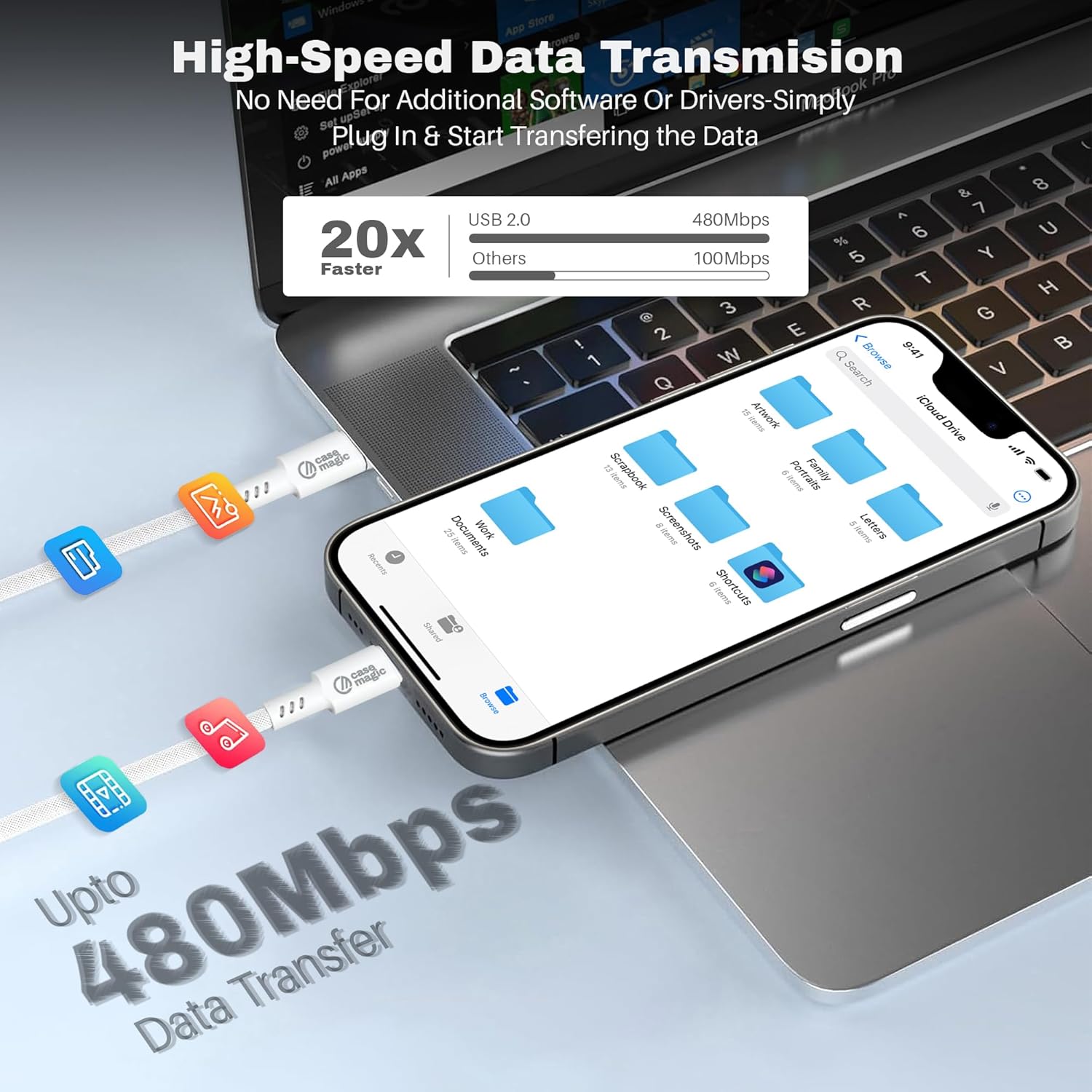 High-Speed 480Mbps Data Transfer: Supports data syncing up to 480Mbps, ideal for quickly transferring files, music, or videos. Perfect for users needing a fast iPhone charging cable that also handles content transfer.