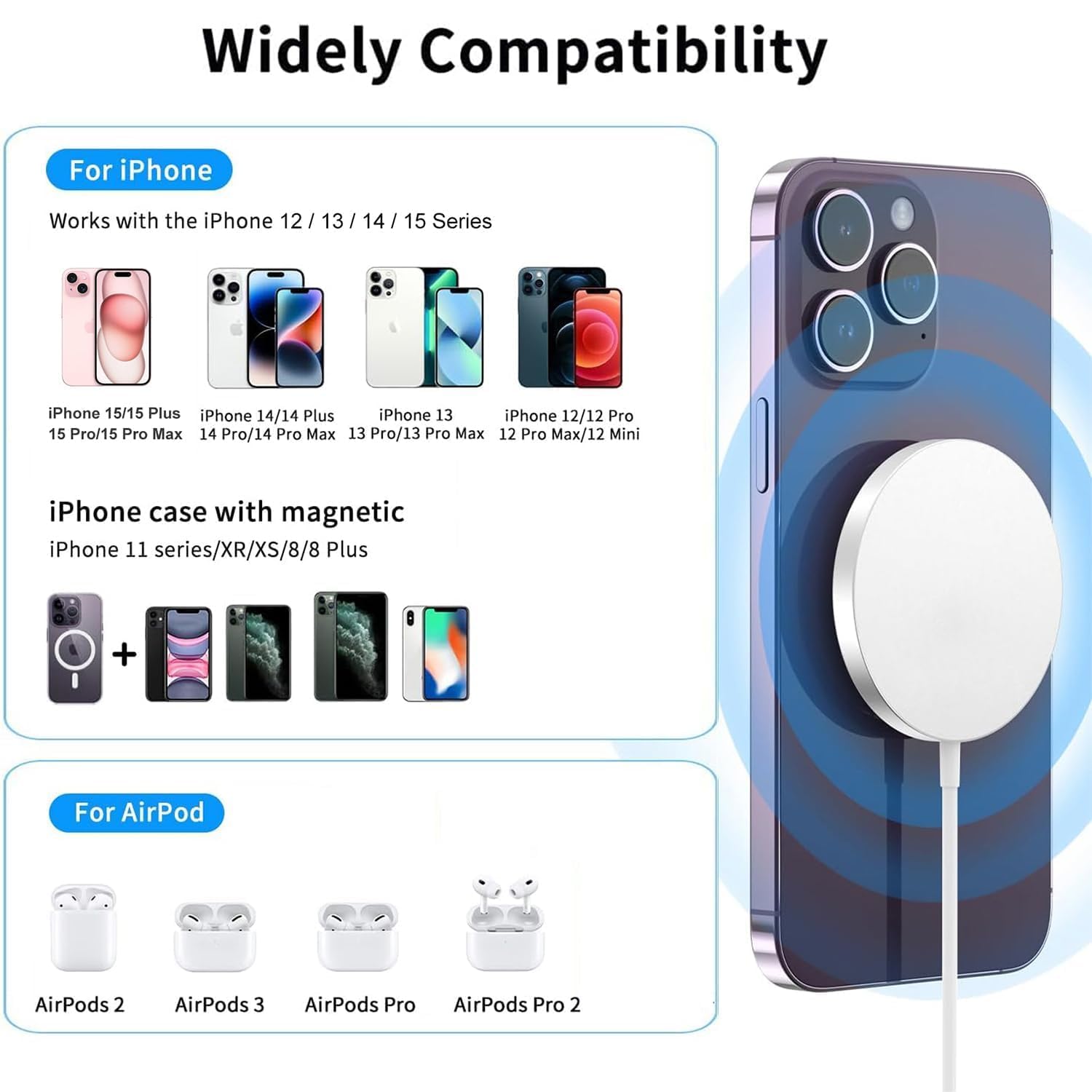 Experience the ultimate convenience with our Mag-Safe charger 15W Wireless Charger, designed to provide fast, secure, and efficient charging for your device Comatioble for iPhone 17/16/15/14/13/12 Series, Air-Pods, and other Qi-compatible devices. Engineered with built-in strong magnets for precise alignment, this charger ensures a hassle-free, secure connection every time. The lightweight and portable design makes it an ideal travel companion, while its sleek white finish complements any setting. Say goodbye to tangled cables and inefficient charging. Whether at home, in the office, or on the go, this anti-slip charging pad ensures stability and efficiency. Upgrade your charging experience with this affordable yet premium alternative, designed for modern lifestyles.