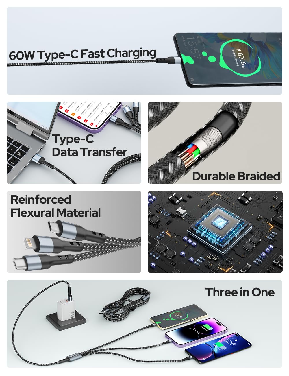 🚀 Note :This 3-in-1 fast charging cable is recommended to use a USB power adapter with a minimum output of 3A to achieve fast charging (Does not support Apple CarPlay.)