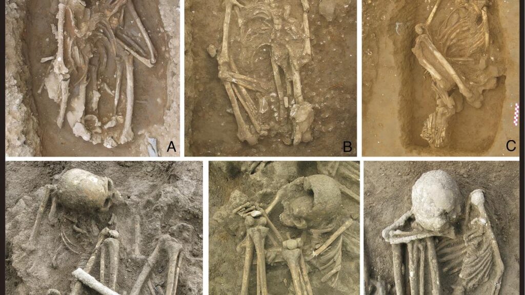 About 84% of the tested bones showed elevated crystallinity and nearly a third reached values typical of stronger heating. Diffraction identified several samples heated to around 525º C or more. Burn traces clustered on the forehead, knees, and elbows while other parts showed only mild or no changes. Crucially, different bones from the same individual often recorded different heat levels, which was evidence against effects due to the soil. Together with the extreme crouching, which left no empty space for soft tissue, the results fit a scenario in which bodies were tightly bound and suspended over smoky, low fires for long periods, then kept for a time and finally buried.