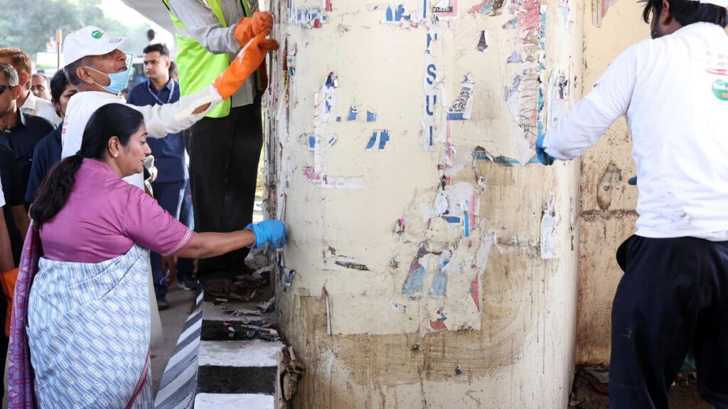 Chief Minister Rekha Gupta led a cleanliness drive on Tuesday at the Ring Road, urging citizens to refrain from defacing walls with posters or graffiti.