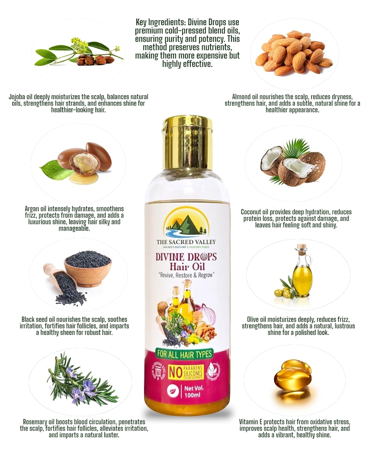 Discover the secrets to vibrant, healthy hair with Divine Drops Hair Oil, a blend of rosemary, almond, argan, castor, jojoba, coconut, extra virgin olive oil, and vitamin E. This carefully crafted formula nourishes and hydrates strands, strengthens and protects against damage, soothes the scalp, enhances shine, and is suitable for all hair types. Apply before washing, incorporate into your usual shampoo and conditioning routine, or use as a styling aid for smooth, glossy locks. Experience the natural benefits of Divine Drops Hair Oil and unlock the potential for radiant hair. Explore the comprehensive solution for your hair care needs with Divine Drops Hair Oil, meticulously formulated with a blend of botanical extracts including rosemary, almond, argan, castor, jojoba, coconut, extra virgin olive oil, and vitamin E. This nourishing, strengthens against damage, soothes the scalp, and enhances shine, tailored for diverse hair types. Elevate your hair care regimen with Divine Drops Hair Oil and revel in the allure of healthy, radiant locks every day.
