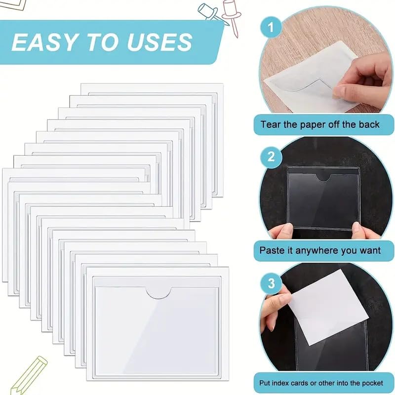 Excellence: the front side of self-adhesive card pockets is clear which is easy to check the information of your cards, the back side has a white peel-away liner, easy to peel away, and the glue of index card pocket has good stickiness and is not easy to fall off.