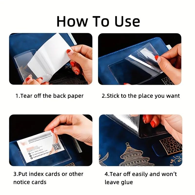 Just put your cards, nameplate or photo into the card pocket, and tear off the back sticker of the pocket, then you can stick the pocket at your desk, notebook, journals, wall and other places as you like.