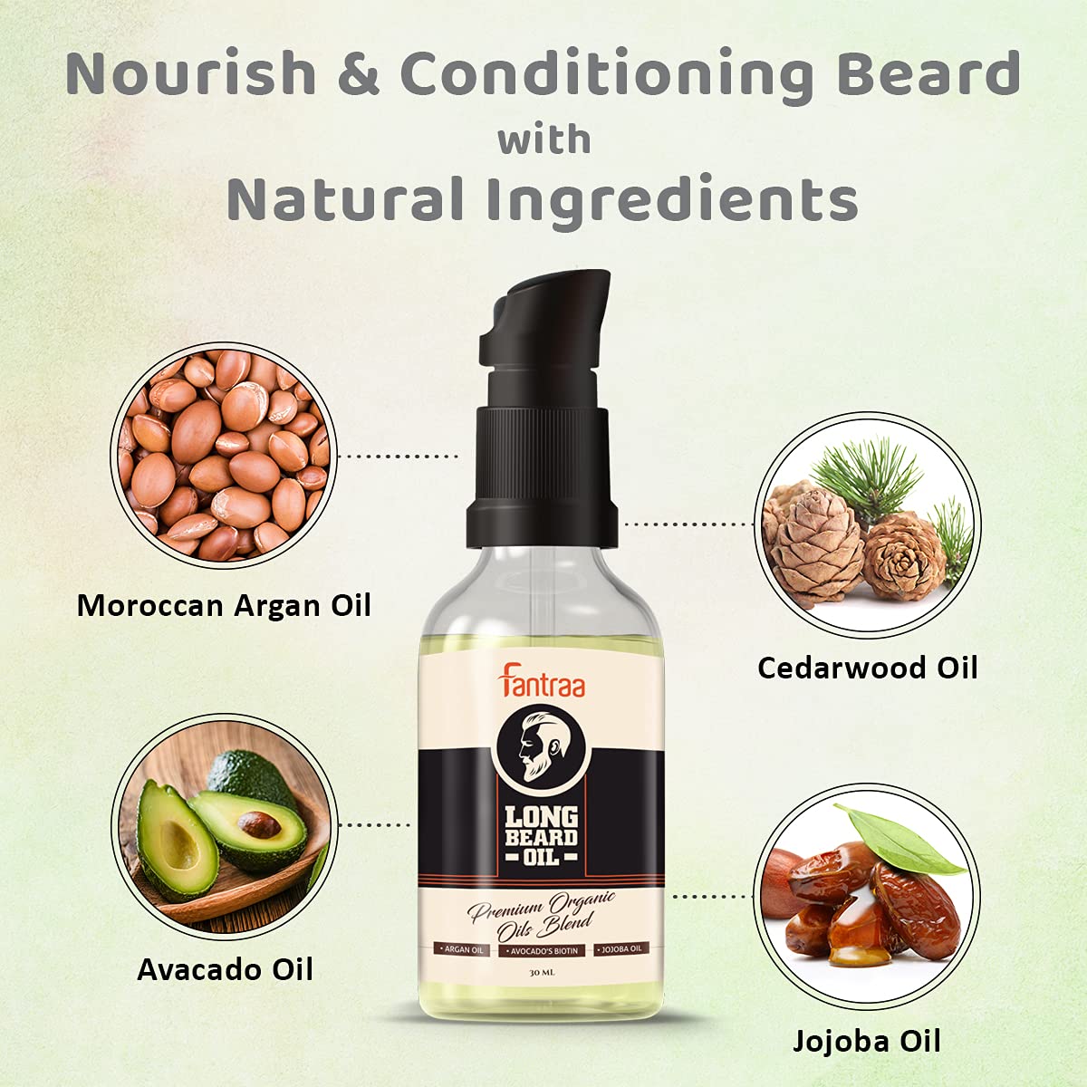 Fantraa Long Beard Oil for Men- 30 Ml| Best Beard Oil Conditioner with Avocado Oil, Argan and Jojoba Oil| Prevents Split Ends and Healthy Beard Growth| Non Sticky
