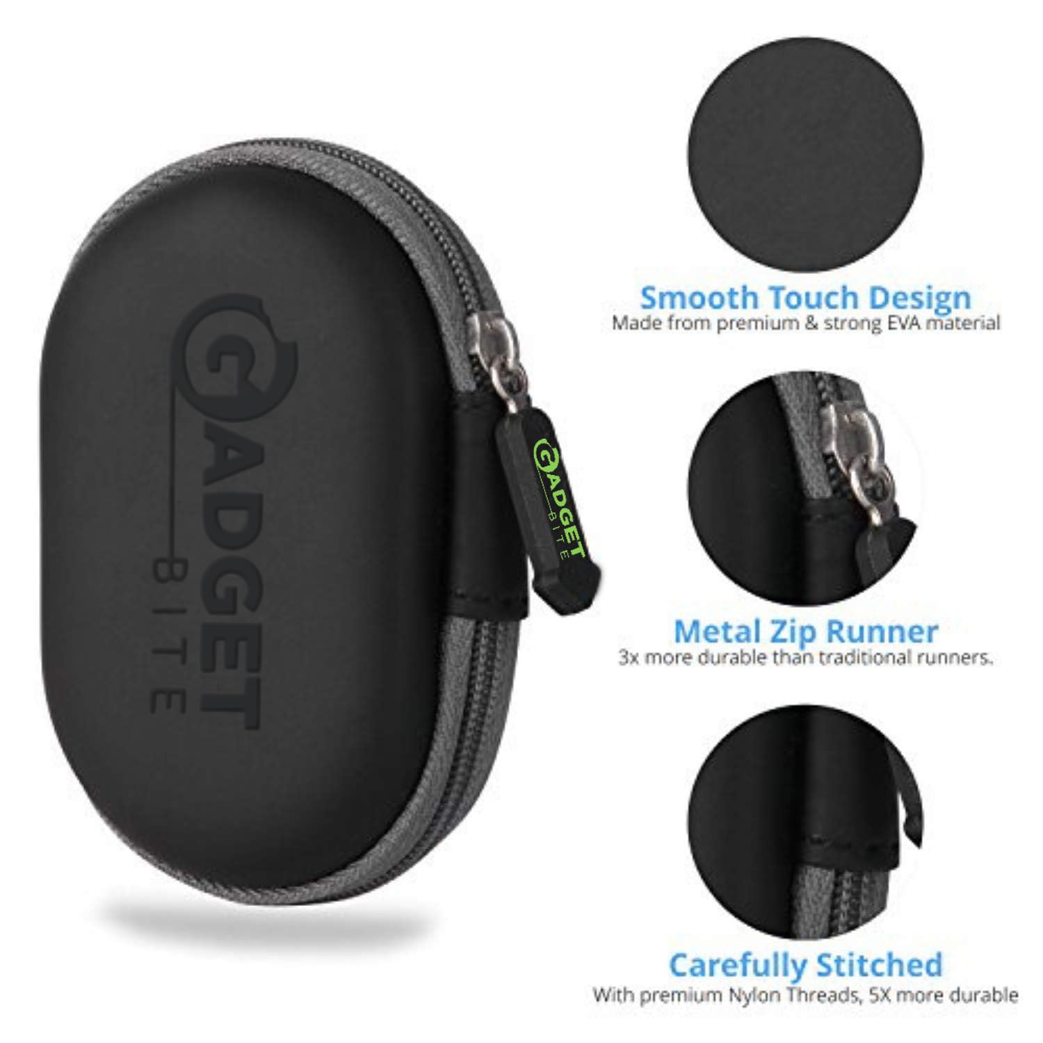 Spacious Interior: Cleverly designed, the GadgetBite case offers plenty of space in the inside. You can use the GadgetBite case to store and carry anything! What you store is limited only by your imagination. Can be used for earphones, power banks, USB cables, connection cables, pen drives, memory cards, coins, jewellery, screws, connectors and other knick knacks. There is also an inner mesh pocket to store smaller objects securely Versatile Hook: The GadgetBite case comes with a versatile high quality carabiner clip which can be hooked to any bag or belt or just be used as a handle for carrying. Shock Protection: The semi rigid body offers maximum protection against accidental bumps and falls. It does not transfer the impact and shock to the inside. Slim and Compact: Even though it offers shock protection, the GadgetBite case is still slim, compact and has a rich black colour with contrasting blue zippers. Best Quality: With high quality materials, best quality rubber zip puller and blue zip, fit and finish this is the best quality possible! Warranty: Comes with 1 Year limited warranty against manufacturing defects. More Reasons To Buy This 1. Spacious Interior: Cleverly designed, the GadgetBite case offers plenty of space in the inside. You can use the GadgetBite case to store and carry your earphones and other small accessories! 2. Slim and Compact: Even though it offers shock protection, the GadgetBite case is still slim, compact and has a rich black color with contrasting blue zippers. 3. Superior quality: Soft synthetic Lycra material, best quality rubber zip puller and green zip, fit & finish this is the best quality and lightweight.