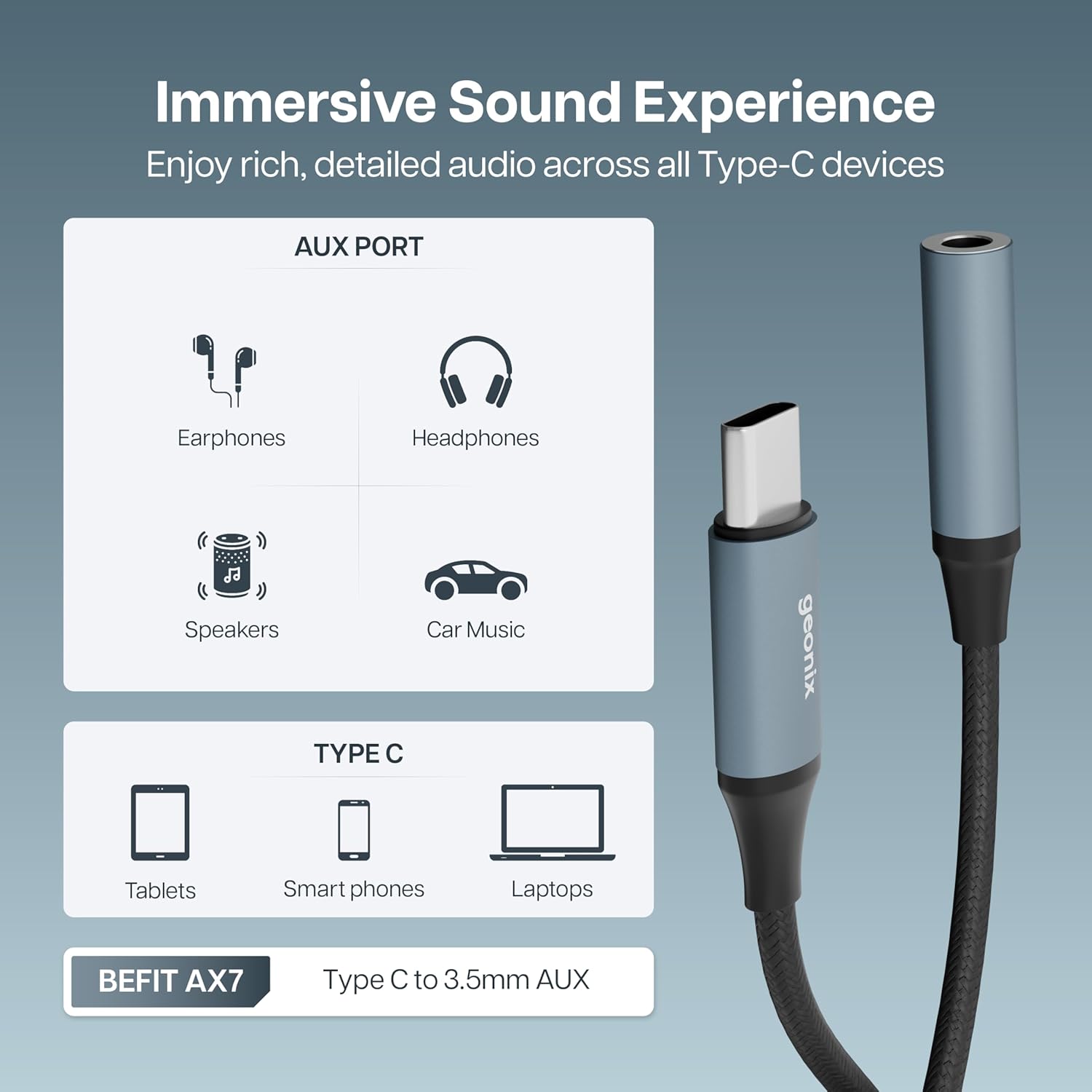 Geonix Befit AX7 Type C to 3.5mm AUX Adapter | Built-in DAC | Mic & Audio Support | Plug & Play | Nylon Braided & Aluminum Alloy | Compatible with Smartphones, Tablets & Laptops