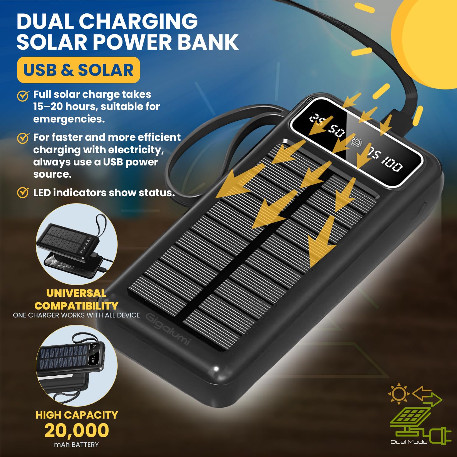 GIGALUMI 20000mAh Solar Power Bank Built-in COB Flashlight Portable Charging Device with LED Indicators 2 USB Output Ports & USB-A to Micro-USB Cable for Smartphones Tablets (Pack of 1, Black)