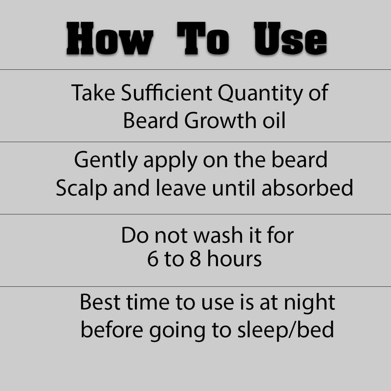 HOW TO USE: Use the dropper to dispense 3 to 4 drops of the product. Gently massage this nourishing yet non-sticky serum on the roots of the beard to stimulate hair growth
