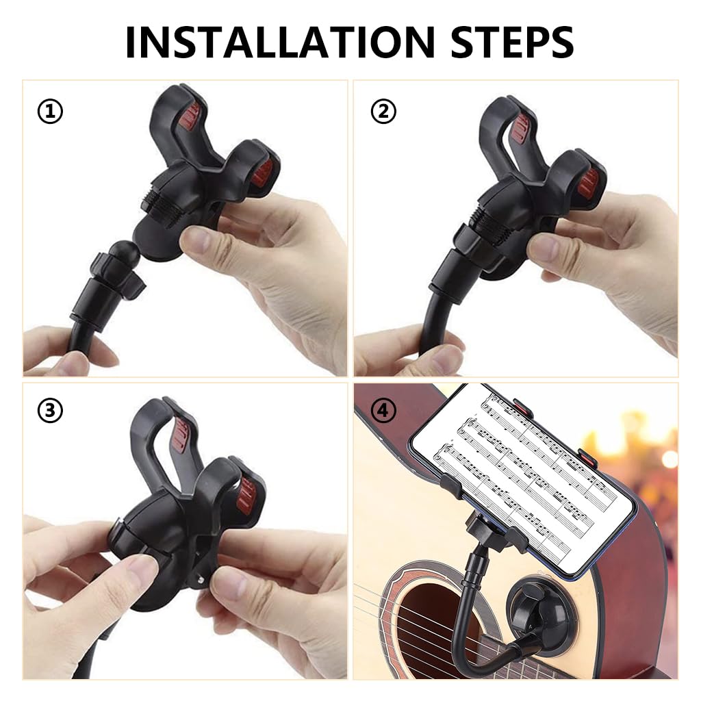 SECURE SUCTION MOUNT: This guitar phone holder features a powerful suction cup base that firmly attaches to clean, flat guitar surfaces or nearby stands, ensuring a stable hold even during active practice or performance sessions. It prevents slipping, vibration, and unwanted movement so you can focus entirely on your music with peace of mind.