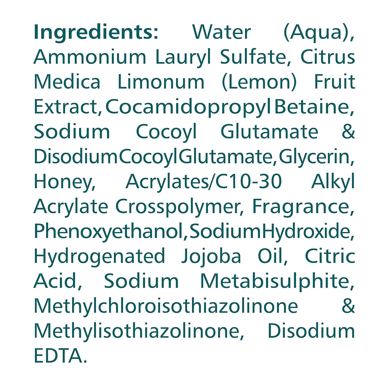 Ingredients: Water (Aqua), Ammonium Lauryl Sulfate, Citrus Medica Limonum (Lemon) Fruit Extract, Cocamidopropyl Betaine, Sodium Cocoyl Glutamate & Disodium Cocoyl Glutamate, Glycerin, Honey, Acrylates/C10-30 Alkyl Acrylate Crosspolymer, Fragrance, Phenoxyethanol, Sodium Hydroxide, Hydrogenated Jojoba Oil, Citric Acid, Sodium Metabisulphite, Methylchloroisothiazolinone & Methylisothiazolinone, Disodium Edta
