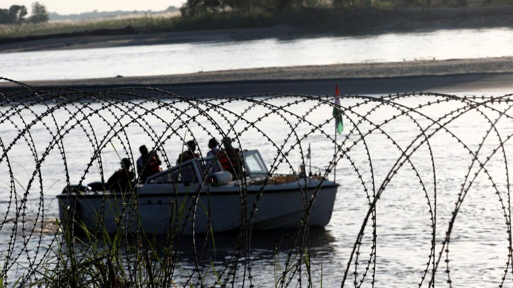 Border Security Force (BSF) personnel patrol on a boat at Chenab river ahead of Diwali festival near India-Pakistan border on October 10, 2025.