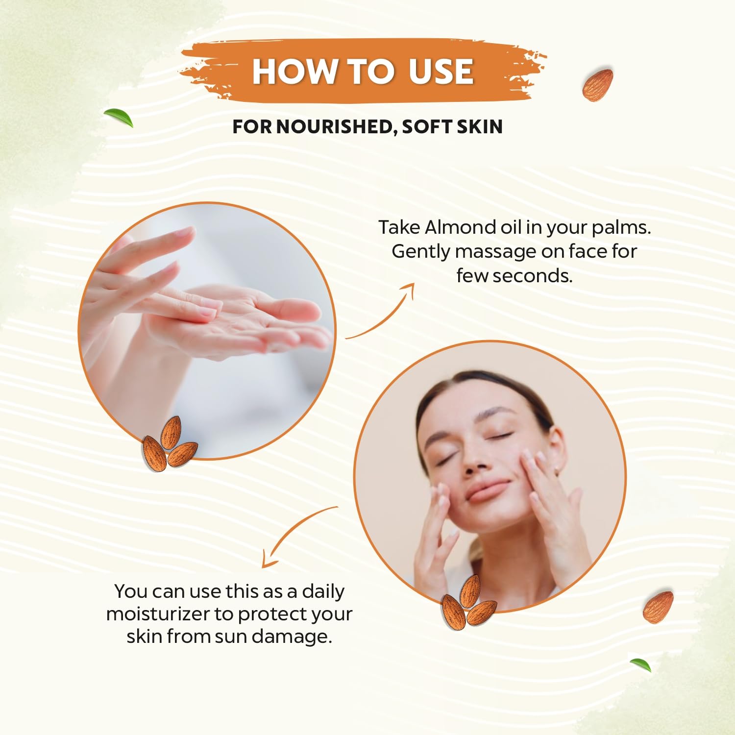 𝐅𝐨𝐫 𝐡𝐚𝐢𝐫 𝐚𝐧𝐝 𝐬𝐤𝐢𝐧𝐜𝐚𝐫𝐞: Rich in vitamin E, almond oil helps lighten dark spots, under-eye dark circles, boosts hair growth, reduces hair loss, frizz and repairs damage bringing healthy hair and radiant skin glow