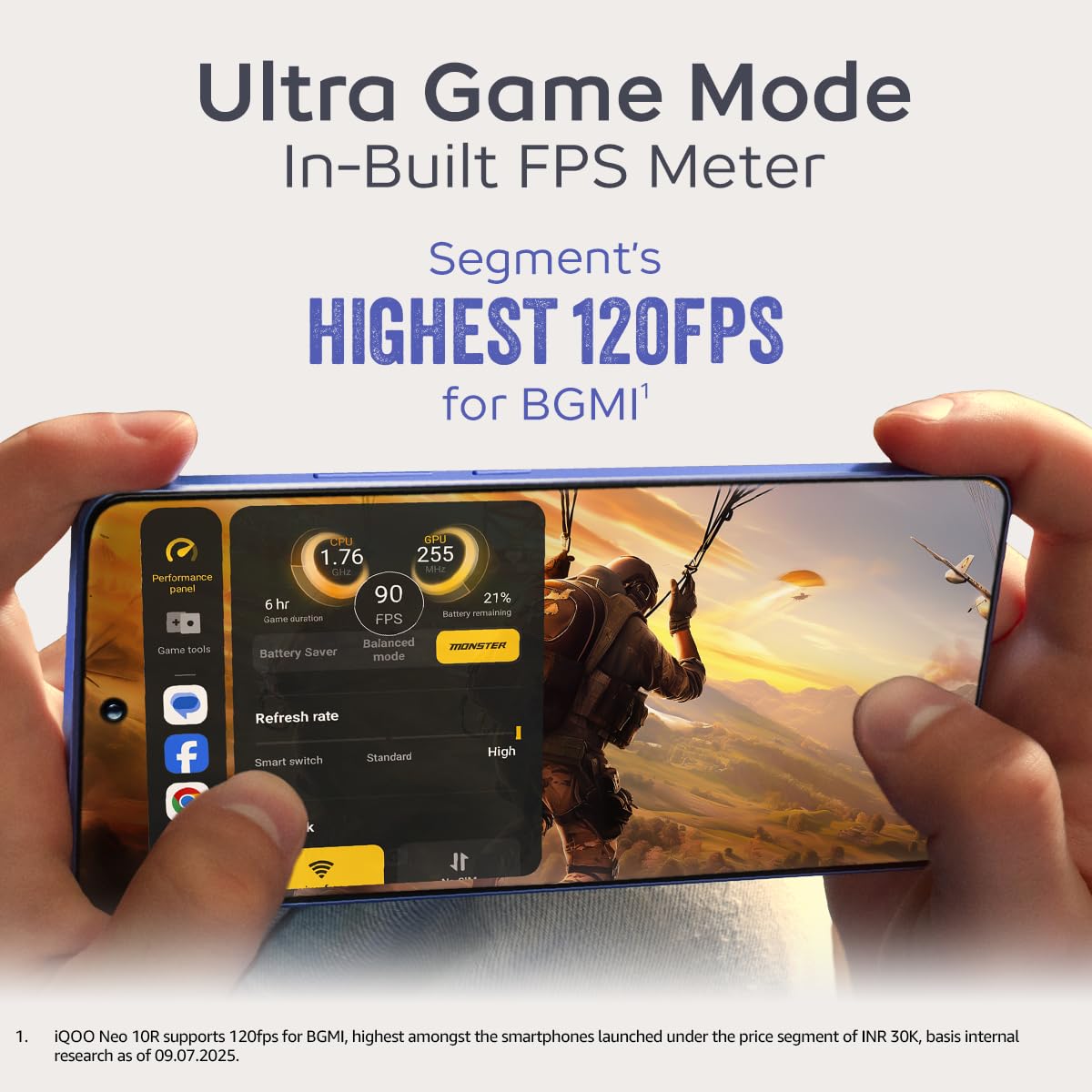 ULTRA STABLE GAMING: 5 hours non-stop most* stable 90fps in the segment. Stable gaming performance with 6043 mm² vapor chamber, an even larger “chip” cooling area for enhanced heat dissipation, Bypass Charging, In-built FPS Meter & 2000 Hz Instant Touch Sampling Rate.