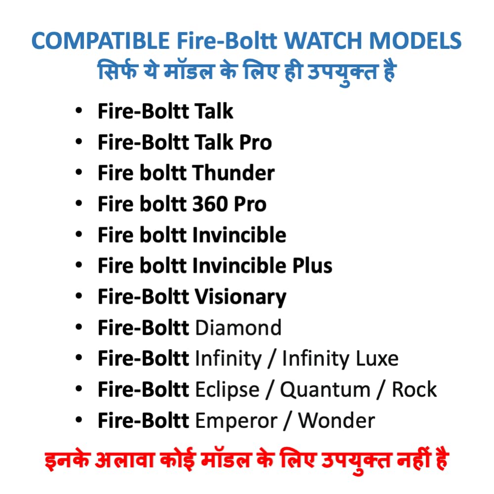Thunder / 360 Pro / Visionary / Invincible / Invincible Plus / Diamond / Infinity / Infinity Luxe / Eclipse / Quantum / Rock / Emperor / Wonder smartwatches. Please note that is not the original Fire Boltt charging cable, but a high quality replacement cable only.