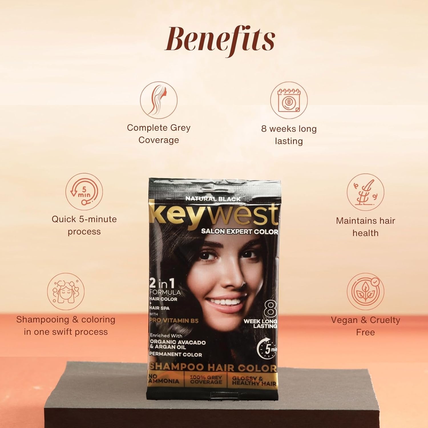 Keywest Natural Black 5 Minute Shampoo Hair Colour – 15ml x 10 Pouches | Enriched with Organic Avocado & Argan Oil (100% Grey Coverage, Ammonia Free, 150ml)