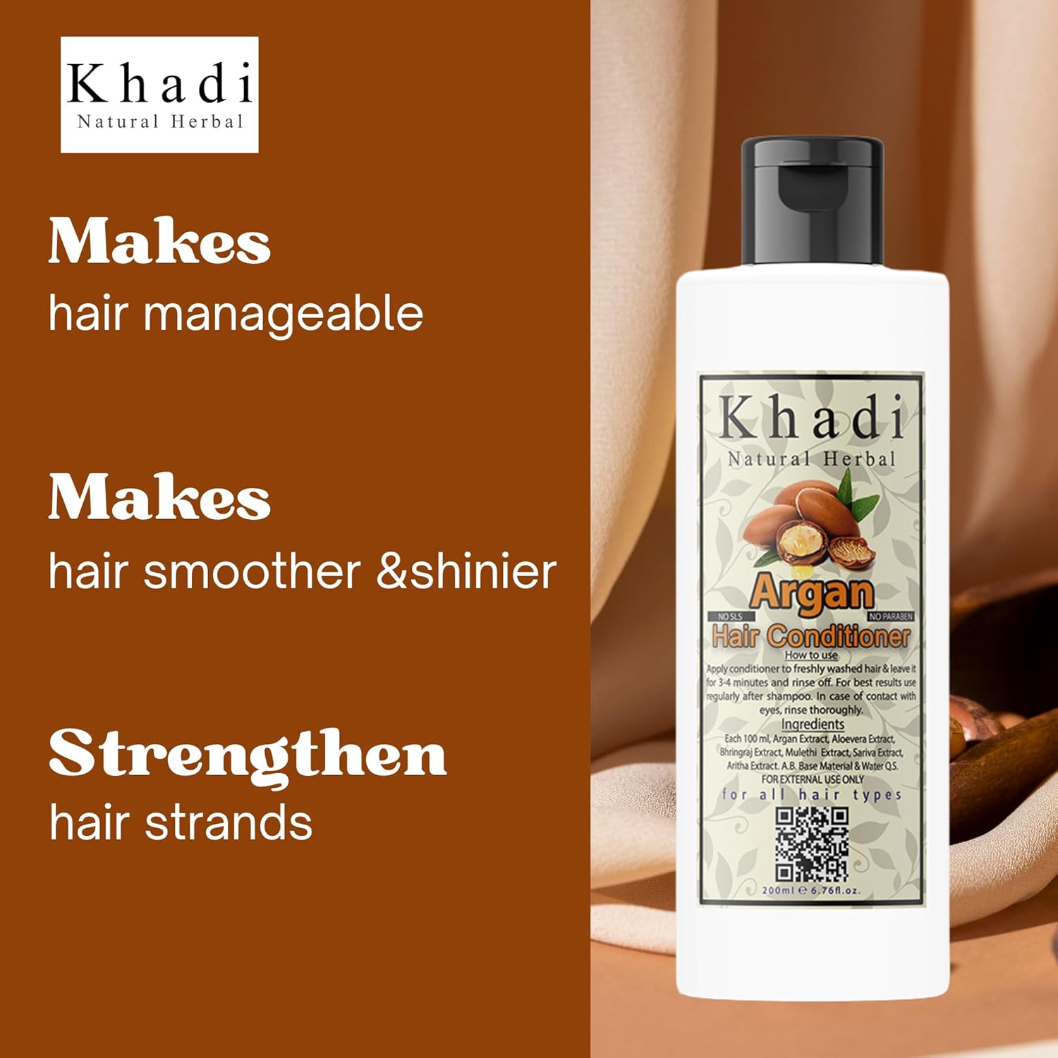 Khadi Natural Herbal Argan Conditioner is a hair care product that is formulated with the goodness of argan oil, which is known for its nourishing and moisturizing properties.It helps to deeply condition and hydrate the hair, making it soft, smooth, and manageable.The argan oil in this conditioner helps to repair damaged hair and prevent further damage, leaving the hair healthy and strong.