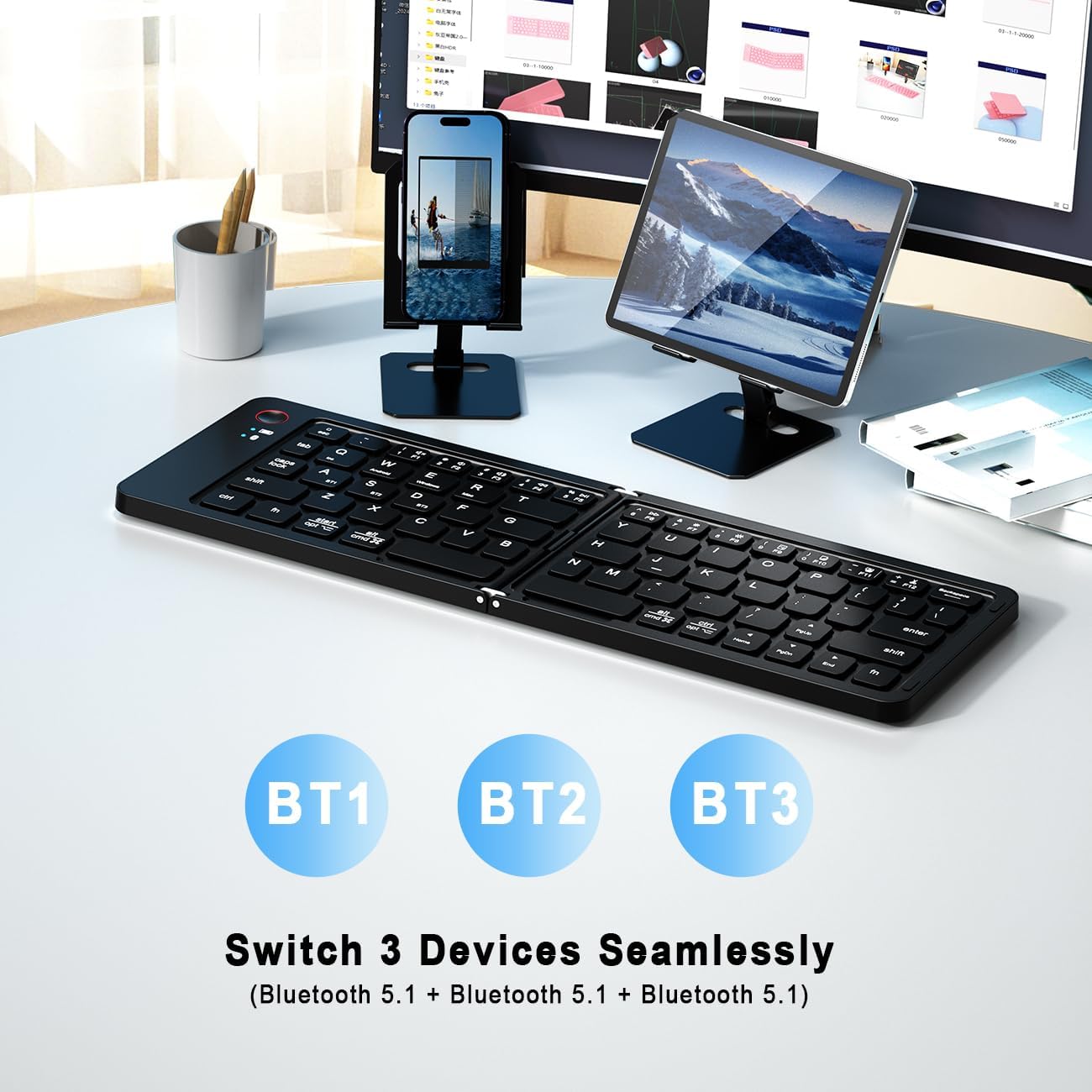 INTRODUCING THE BLUETOOTH FOLDABLE KEYBOARD: Take your work anywhere, anytime with this portable folding keyboard that comes with a complimentary phone holder. The keyboard design ensures precise and swift typing, mirroring the experience of your familiar desktop keyboard. The quiet keys enable you to concentrate on your tasks without distraction. With its Bi-Fold design Ideal for both travel and business trips.