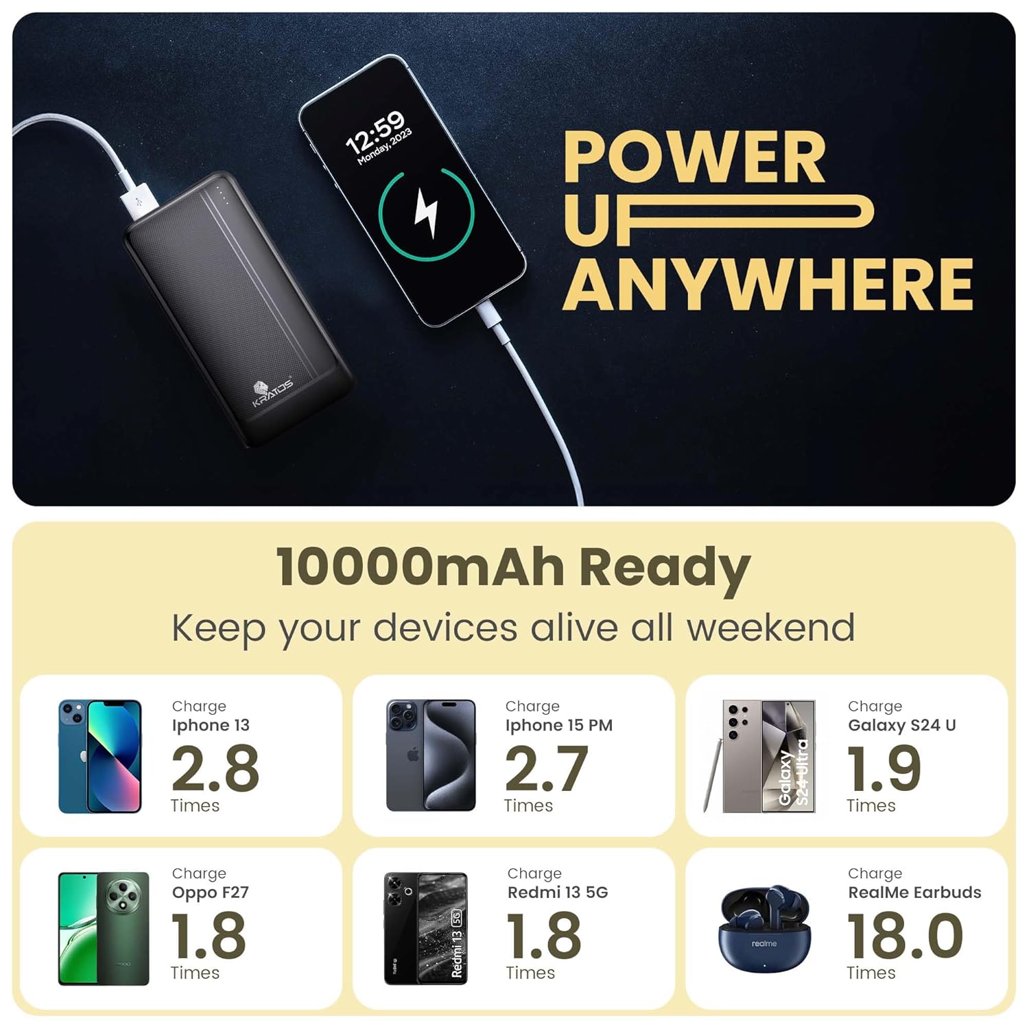 10000 mAh Power Bank : The Fast and Efficient 10000 mah powerbank, ensuring multiple charges for your devices. With its 10000 mah battery capacity, stay powered on the go with reliable and quick charging whenever you need it