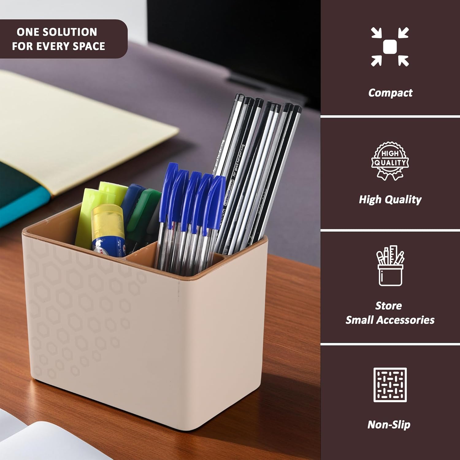 ✅ Package Contains – (1 Pcs) Pen Stand/Stationary Items | Color – Sandy Brown | Material – Plastic | Product Dimensions – 14 cm x 9 cm x 11 cm