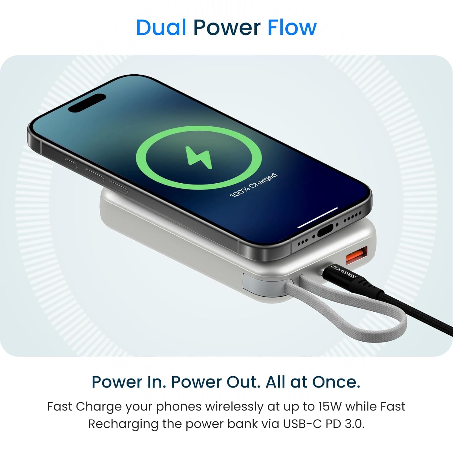 Built-In USB-C Cable + PD 20W – No need to carry extra cables. Supports 20W fast wired charging for phones, tablets, and other Type-C devices.