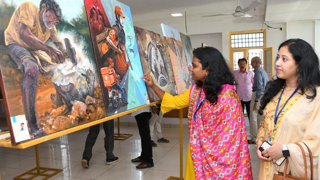 Visitors explore the Samayika Jeevanam photo exhibition, held alongside a seminar reflecting on the role of art in today’s society in Vijayawada on Sunday.