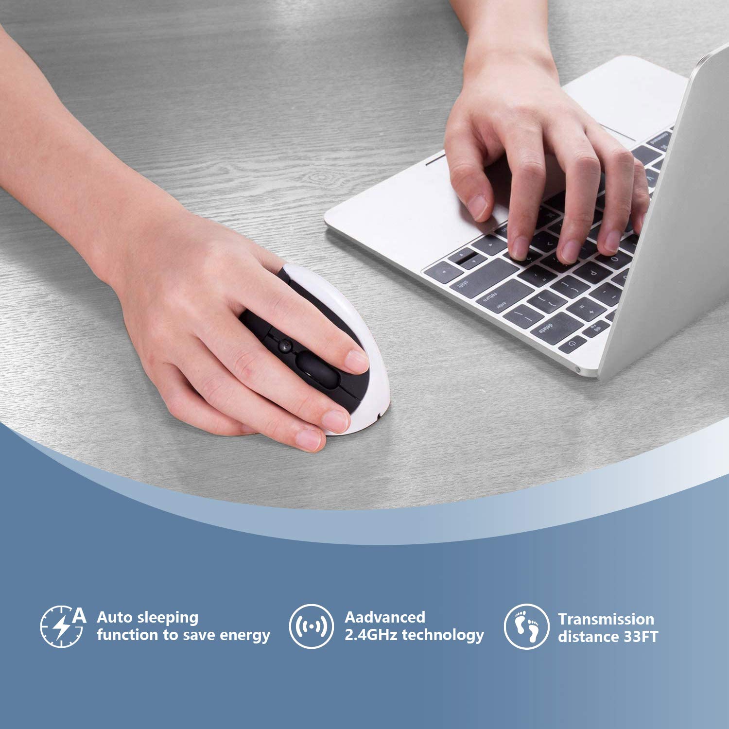 3. HIGH-CAPACITY RECHARGEABLE BATTERY VERTICAL WIRELESS MOUSE : Built-in rechargeable 350mAh battery, Double Battery Power than other brands. You no longer need to buy batteries, very convenient !! Recharge Quick-connect design allows you to switch from wireless to a charging cable connection so you never run out of power ( The 2.4G USB receiver need be plugged on the device).