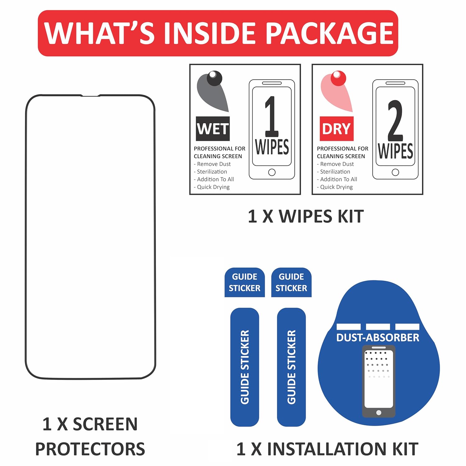 Installation Kit : 1- Wet Wipes, 1-Dry Wipe, 1- Dust Absorber , 1-Guide Sticker