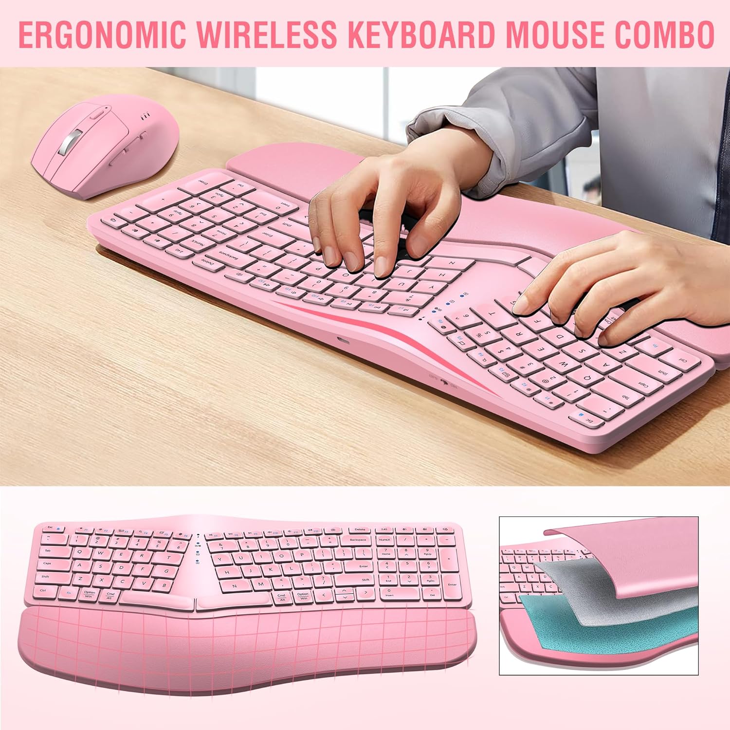 MK960 Ergonomic Wireless Keyboard Mouse Combo, Bluetooth/2.4G Split Design Keyboard with Palm Rest and 4 Level DPI Adjustable Wireless Mouse Multi-Device, Rechargeable, for Windows/Mac/Android(Pink)