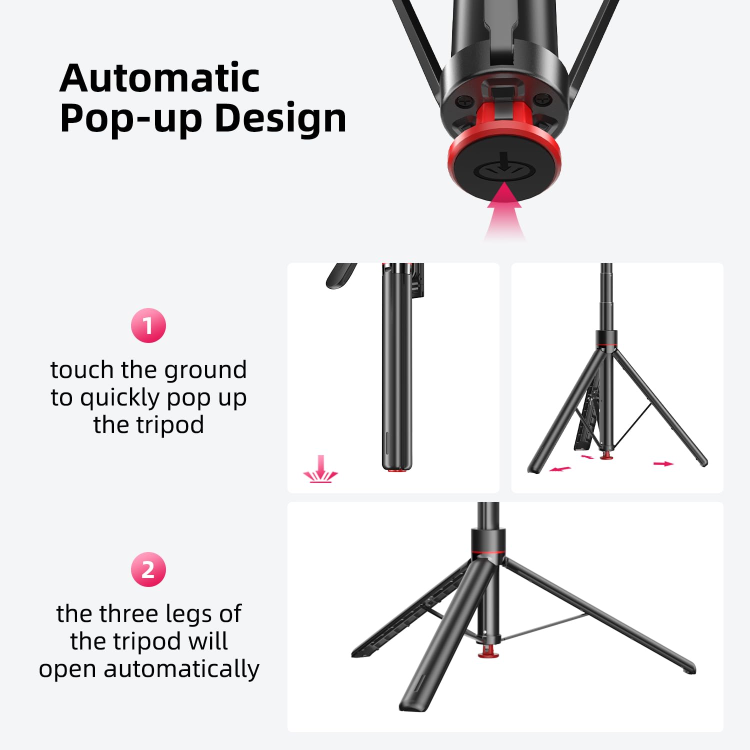 Auto-Pop Open Tripod – Innovative tripod base instantly opens with a simple press, saving time and ensuring quick setup for shooting anywhere.