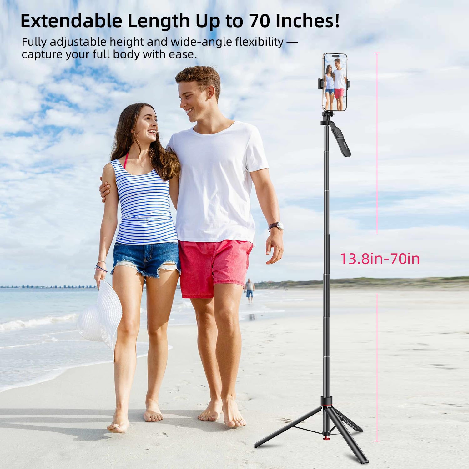 Tall 70-Inch Extension – Extendable up to 70 inches, perfect for group photos, travel vlogs, live streaming, or overhead shooting.