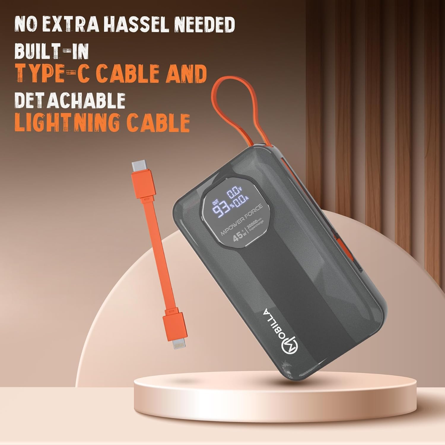 Built-In Type-C & Detachable Lightning Cables: Comes with an integrated Type-C cable for Android and Type-C devices, along with a detachable Lightning cable for iOS devices. No need to carry separate wires.