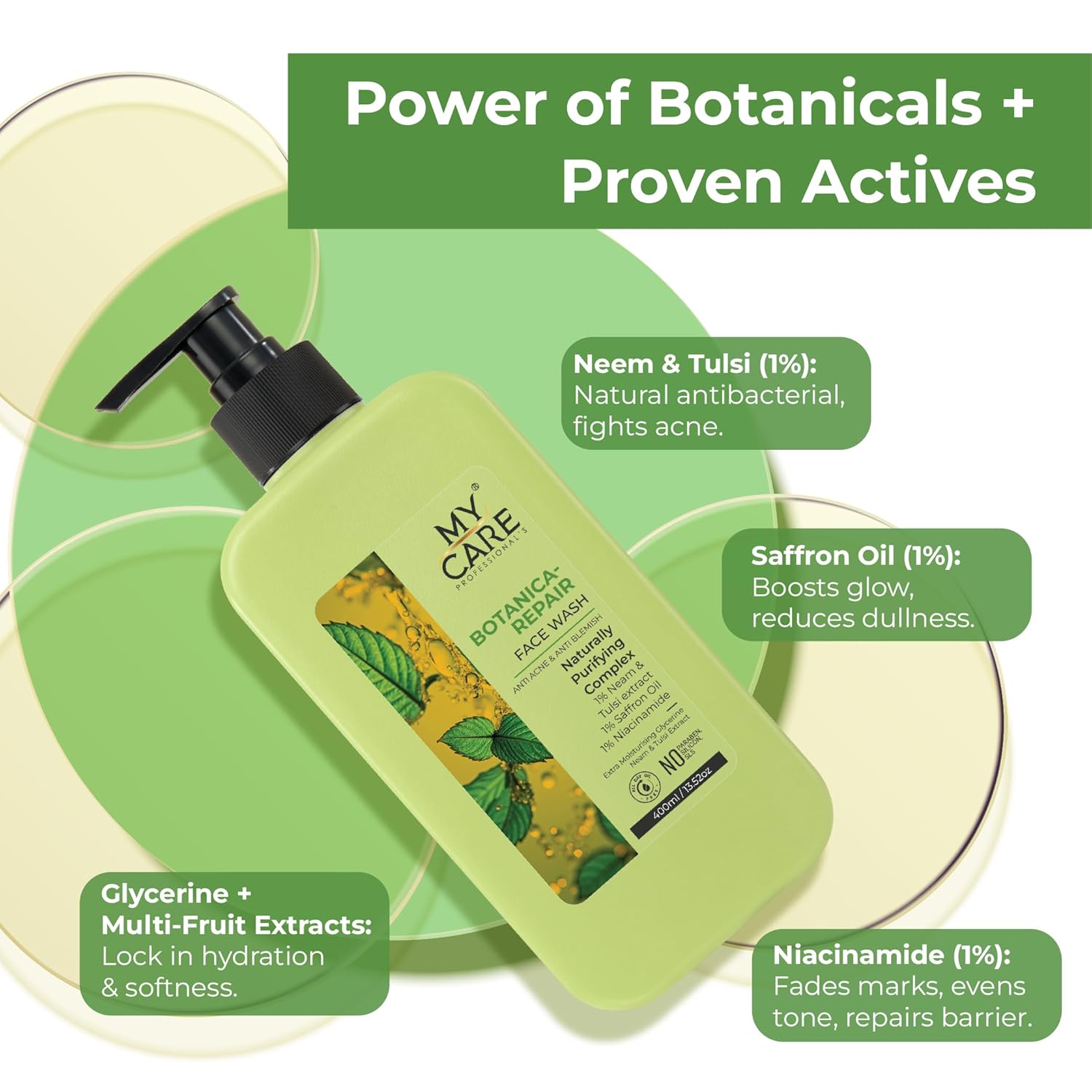 Neem 1% + Tulsi 1% + Saffron Oil 1% + Niacinamide 1% + Glycerine Rose Petal Extracts + 1% Vitamin F + 1% Provitamin B5 + Glycerine Multi-Fruit Extracts (Strawberry 1% + Cucumber 1%) + 1% Provitamin B5 + Glycerine