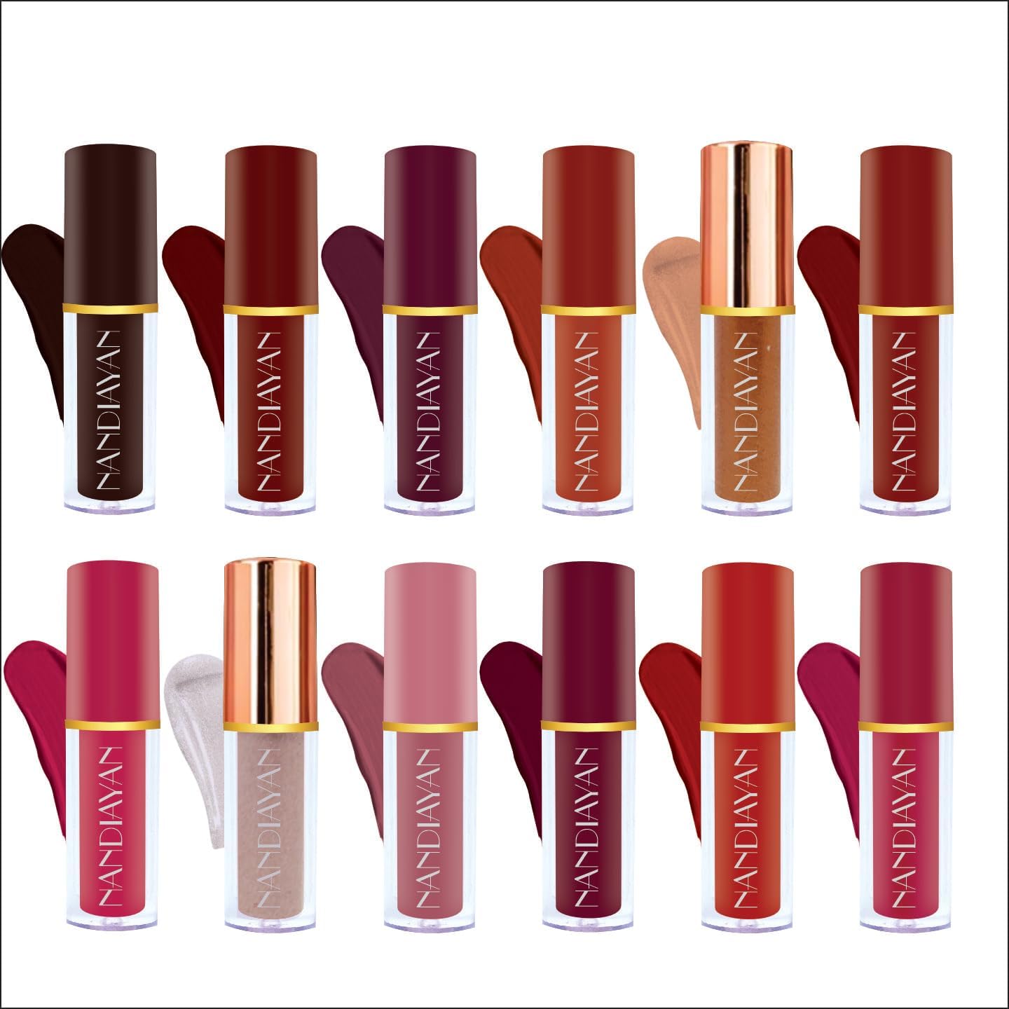 Mini matte liquid lipstick combo pack of 12 with bold dark shades like burgundy, wine, deep plum, maroon, coffee brown, and classic red, perfect for dusky skin tone and everyday glam look