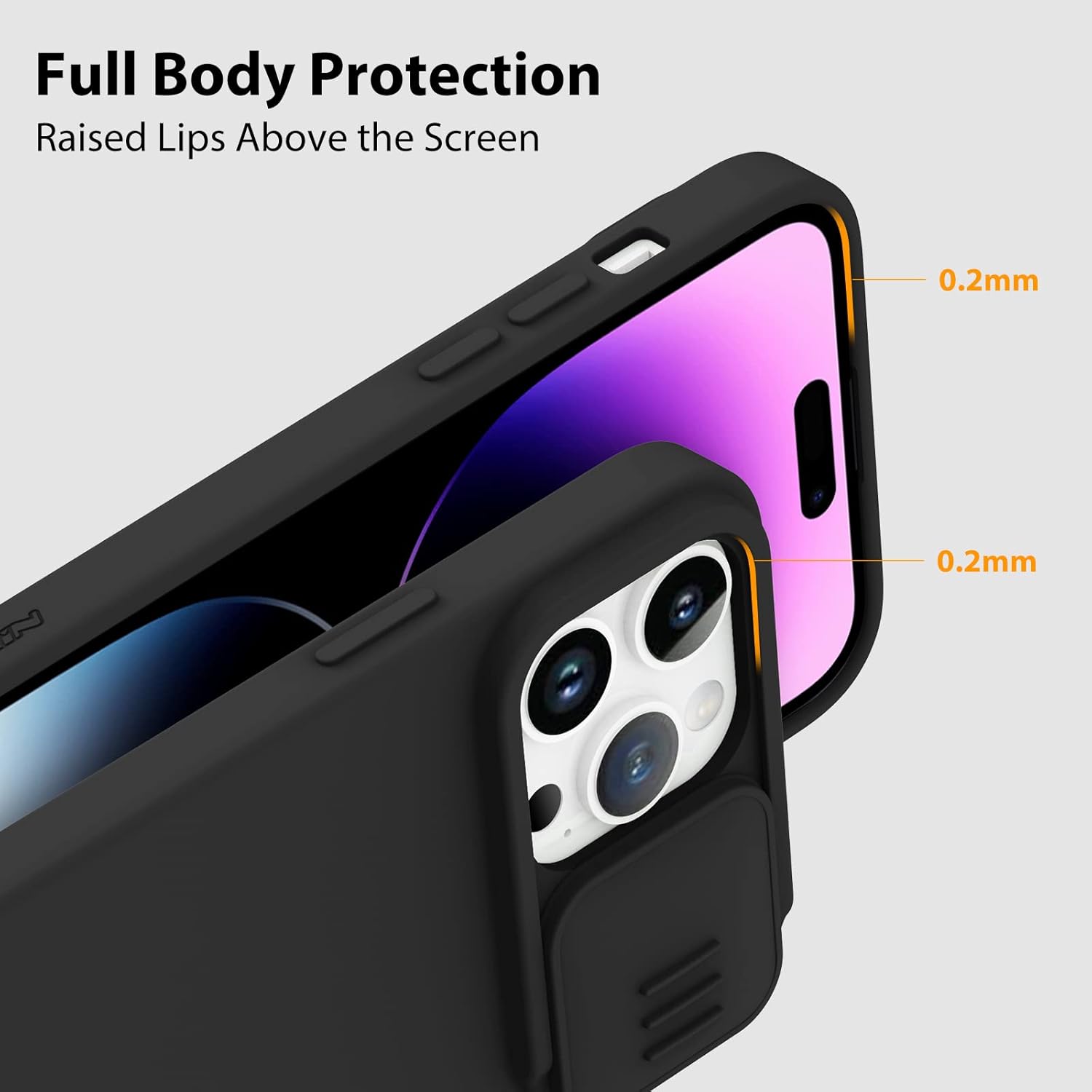 Four Layer Structure – The soft microfiber lining and Built-in magnet, rigid and durable inner hard PC layer and liquid silicone exterior, 1.2mm Raised frame at the edge of camera and screen for iPhone 14 Pro Max, Making sure that bumps and drops do no damage to your phone.